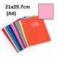 Protège-cahier grain pour la protection des cahiers format A4 21x29,7cm. Plastique de qualité de 18/100ème incrusté de forme losange. Sur le dessus, porte étiquette pour personnaliser son cahier. Couleur rose.